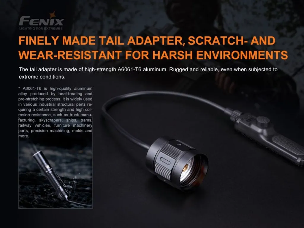Fenix AER-04 remote pressure switch is designed for those flashlights which run with 21700 battery. Its tail adapter is made of A6061-T6 aluminum with type III hard-anodized and anti-abrasive finish. The dual tail switch panel includes a full-silent forward switch and a tape switch; allowing easy and fast operation of momentary-on or constant-on illumination. The innovative full-silent design with attached Velcro makes it very reliable and practical in your tactical missions or hunting.